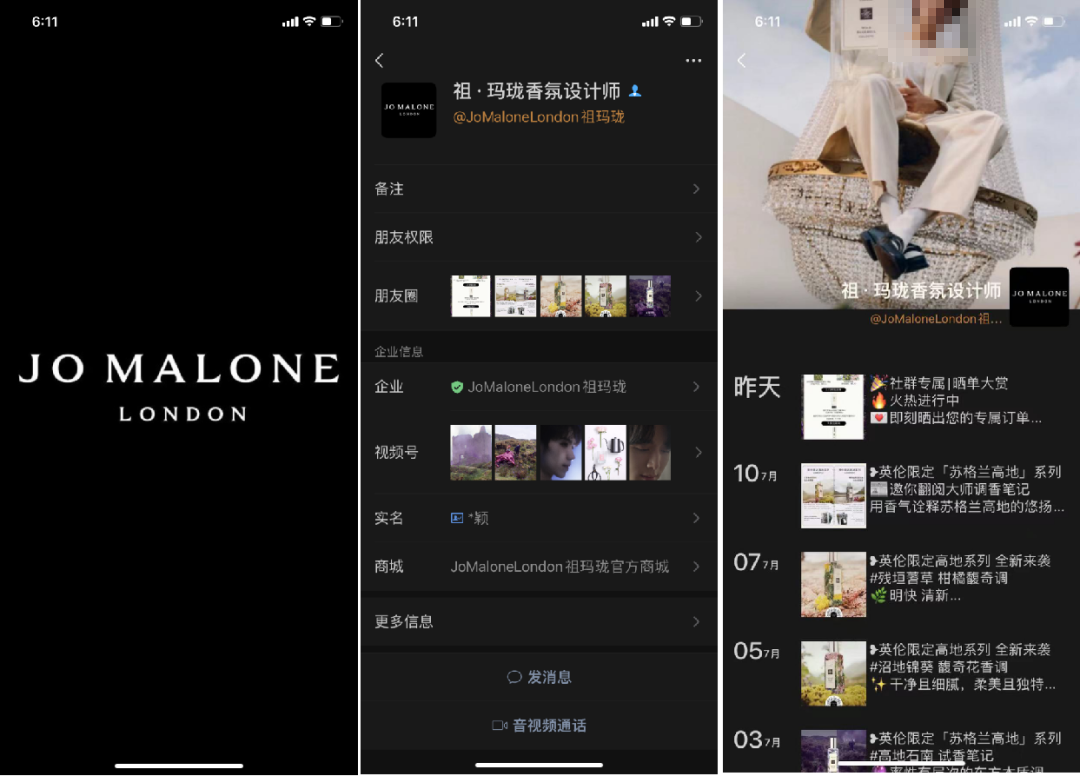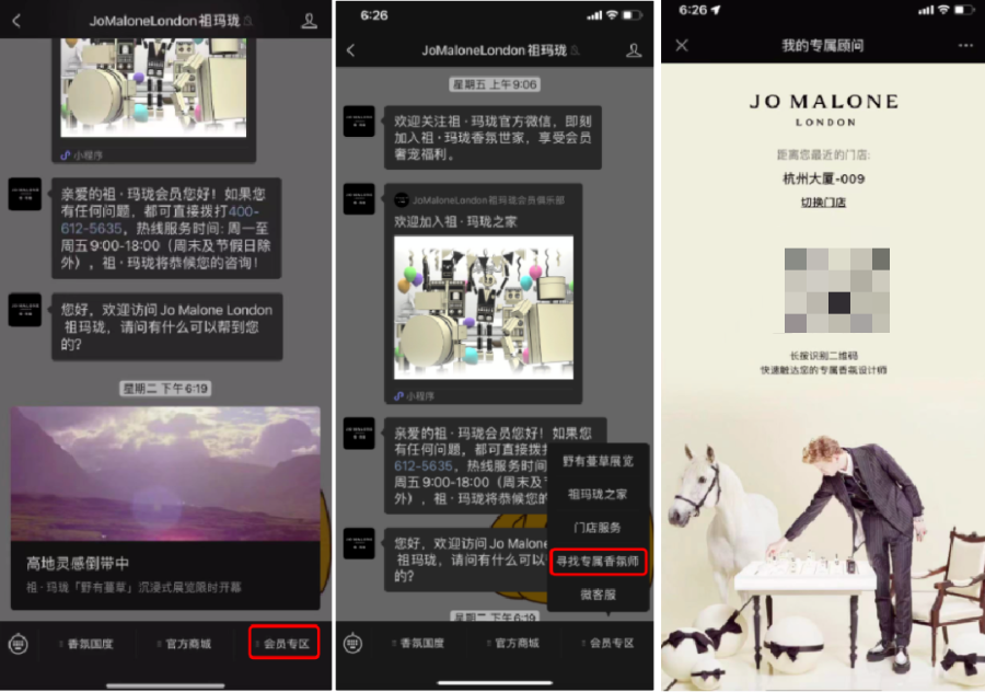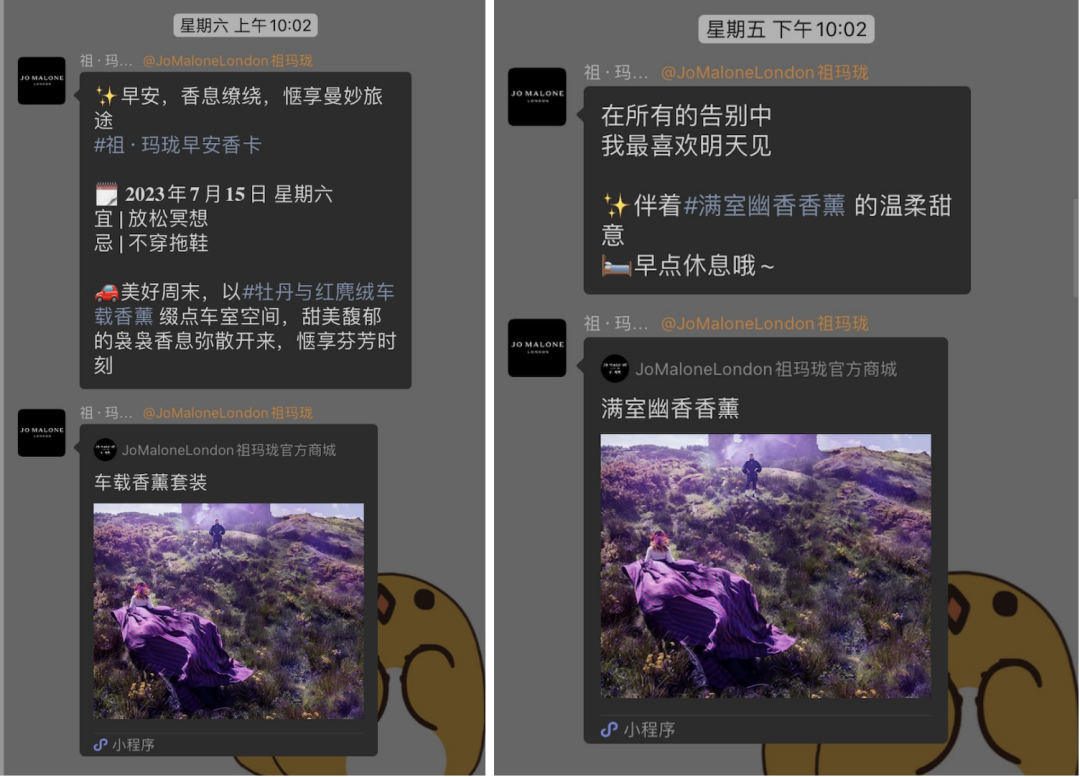 「JoMaloneLondon祖瑪瓏」公眾號(hào)在打招呼語(yǔ)跟菜單欄中都設(shè)置了私域社群的引流入口具體路徑: