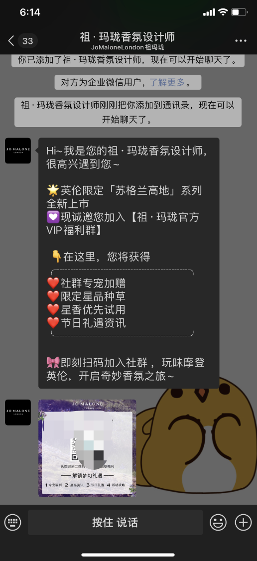 祖瑪瓏對(duì)客服微信進(jìn)行了精細(xì)化打造,企業(yè)IP的角色以香氛設(shè)計(jì)師為主。主要以新品種草、試用征集,發(fā)送節(jié)日福利為主。
