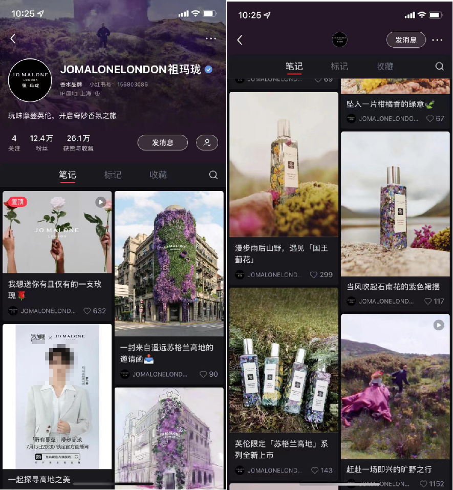 祖瑪瓏在小紅書超過10萬(wàn)+篇筆記,官方賬號(hào)有12.4萬(wàn)的粉絲。主要以產(chǎn)品宣傳為主,有香水、香氛等產(chǎn)品為,每一篇都很有調(diào)性,符合高端品牌的形象。