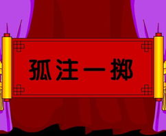 [釋義] 注:賭注;賭博時(shí)所押上的錢;孤注:賭錢的人在輸急時(shí)把所有的錢并在一起作為賭注;擲:這里指賭錢時(shí)擲骰子。賭徒在輸急了的時(shí)候把所有的錢并作一次押上去;以決最后輸贏。比喻在危急時(shí)用盡所有力量做最后一次冒險(xiǎn)。