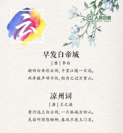 2.遙知不是雪,為有暗香來 3.千里黃云白日,北風(fēng)吹雁雪紛紛 4.晚來天欲雪,能飲一杯無? 5.北風(fēng)卷地百草折,胡天八月即飛雪 6.大雪滿弓刀 7.柴門聞吠,風(fēng)雪夜歸人 8.窗含西嶺千秋雪,門泊東吳萬里船 9.晨起開門雪滿山,雪晴云淡日光寒 10.寒川消積雪,凍浦漸通流 11.都城十日雪,庭戶皓已盈 12.大雪紛紛何所有,明月與我何相見 13.草枯鷹眼疾,雪盡馬蹄輕 14.山回路轉(zhuǎn)不見君,雪上空留馬行處 15.夜深知雪驟,時聞?wù)壑衤? 16.云橫秦嶺千秋雪,雪擁藍關(guān)馬不前 17.殘雪壓枝猶有橘,凍雪驚筍欲抽芽 18.三巴春霽雪初消,百折千回向東去 19.青海長云暗雪山,孤城遙望玉門關(guān) 20.燕山雪花大如席,紛紛吹落軒轅臺 21.大漠沙如雪,燕山月似鉤 22.梅須遜雪三分白,雪卻輸梅一段香 23.千里冰封,萬里雪飄 雨: 自在飛花輕似夢,無邊絲雨細如愁?!巍で赜^《浣溪沙·漠漠輕寒上小樓》 風(fēng)雨凄凄,雞鳴喈喈。
