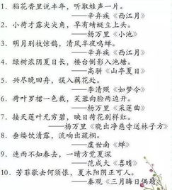 春:1,春眠不覺(jué)曉,處處聞啼鳥(niǎo). 2,紅豆生南園,春來(lái)發(fā)幾枝. 3,好雨知時(shí)節(jié),當(dāng)春乃發(fā)生. 4,不知細(xì)葉誰(shuí)裁出,二月春風(fēng)似剪刀. 夏: 1,力盡不知熱,但惜夏日長(zhǎng). 2,接天蓮葉無(wú)窮碧,映日荷花別樣紅. 秋: 1,秋風(fēng)蕭瑟,洪撥涌起. 2,八月秋高風(fēng)怒號(hào),卷我屋上三重茅. 3,春花秋月何時(shí)了,往事知多少 冬: 1,梅須遜雪三分白,雪卻輸梅一段香. 2,青女素娥俱耐冷,月中霜里斗嬋娟. 風(fēng): 1, 相見(jiàn)時(shí)難別亦難,東風(fēng)無(wú)力百花殘 2,不知細(xì)葉誰(shuí)裁出,二月春風(fēng)似剪刀. 3,云想衣裳花想容,春風(fēng)扶檻露華濃. 花: 1,感時(shí)花濺淚,恨別鳥(niǎo)驚心. 2,曲徑通幽處,禪房花木深. 3,無(wú)可奈何花落去,似曾相識(shí)雁歸來(lái). 4,忽如一夜春風(fēng)來(lái),千樹(shù)萬(wàn)樹(shù)梨花開(kāi). 5,停車(chē)坐愛(ài)楓林晚,霜葉紅于二月花. 雪: 1,遙知不是雪,惟有暗香來(lái) .2,窗含西嶺千秋雪,門(mén)泊東吳萬(wàn)里船. 3,北風(fēng)卷地白草折,胡天八月即飛雪. 月: 1,大漠沙如雪,燕山月似鉤. 2,可憐九月初三夜,露似真珠月似弓. 3,尋常一樣窗前月,繞有梅花便不同. 山: 1,兩岸猿聲啼不住,輕舟已過(guò)萬(wàn)重山. 2,兩岸青山相對(duì)出,孤帆一片日邊來(lái). 水: 1,天門(mén)中斷楚江開(kāi),碧水東流至此回. 2,飛流直下三千尺,疑是銀河落九天. 3,日出江花紅勝火, 春來(lái)江水綠如藍(lán). 4,一道殘陽(yáng)鋪水中,半江瑟瑟半江紅. 1 無(wú)志之人常立志,有志之人立長(zhǎng)志 2 少壯不努力,老大徒傷悲 3 不識(shí)廬山真面目,只緣身在此山中 4 本是同根生,相煎何太急 5 獨(dú)在異鄉(xiāng)為異客,每逢佳節(jié)倍思親 6 粉身碎骨渾不怕,要留清白在人間 7 遙知不是雪,唯有暗香來(lái) 8 莫愁前路無(wú)知己,天下誰(shuí)人不識(shí)君 9 野火燒不盡,春風(fēng)吹又生 10 勸君更盡一杯酒,西出陽(yáng)關(guān)無(wú)故人 11 誰(shuí)知盤(pán)中餐,粒粒皆辛苦 12 小河才露尖尖角,早有蜻蜓立上頭 13 飛流直下三千尺,疑是銀河落九天 14 欲窮千里目,更上一層樓 15 爆竹聲中一歲除,春風(fēng)送暖入屠蘇 16 白兔搗藥成,問(wèn)言與誰(shuí)餐 17 誰(shuí)言寸草心,報(bào)得三春暉 18 舉頭望明月。