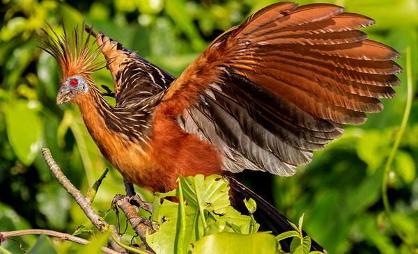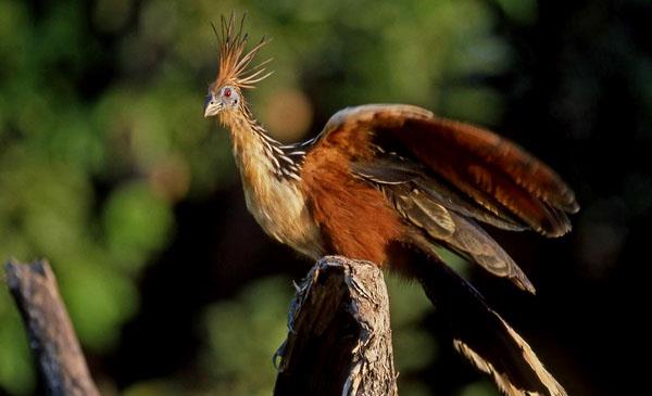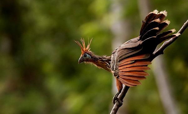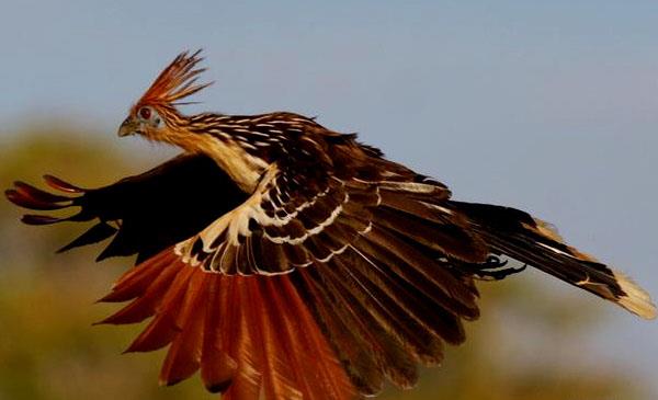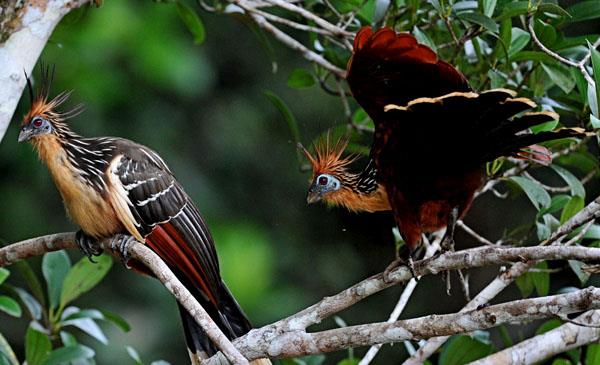 麝雉:別名爪羽雞,為鵑形目、麝雉科、麝雉屬鳥(niǎo)類(lèi),原產(chǎn)于南美洲中部及北部,包括玻利維亞、巴西、哥倫比亞、厄瓜多爾、圭亞那等國(guó)。棲息于亞馬遜河流域的水淹森林、洪澇雨林,不善于飛行卻擅長(zhǎng)游泳,所以常常在水面上方的樹(shù)枝上筑巢活動(dòng)以便及時(shí)泅水逃咶生、躲避敵害。1776年命名,無(wú)亞種。