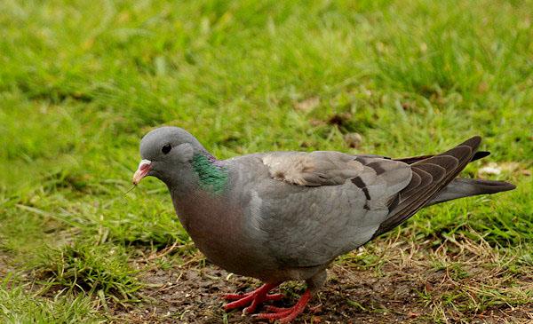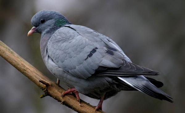 頭體長28-33cm,重約300g。后頸和翕藍灰色,具綠色和輕微淡紫紅色光澤,頸兩側綠色和紫紅色光澤尤為明顯。背、肩藍灰色,下背和兩翅內側覆羽及飛羽為沾褐的暗灰色。翅上覆羽灰色,其上具兩道不完整的黑斑。飛羽、初級覆羽和小翼羽淡褐色。腰及尾上覆羽淡灰色。尾韻灰色較暗,具寬闊的黑色端斑。飛行快速,兩翅煽動快,常常能聽到翅膀的振動聲。