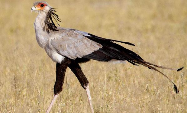 頭體長125-150cm,高120-150cm,重2.3-4.3kg。非洲草原威風凜凜的食蛇猛禽,身形高大,體羽淺灰色,大腿黑色,翅膀后部和尾部的飛羽則覆蓋著黑色羽毛,有白色羽紋。腿長并有厚鱗保護,以免被蛇咬傷。長長的雙腿看上去雖然纖細伶仃,卻威力巨大,用力一踢可以對獵物產生極大的殺傷力。喙短粗帶鉤,眼睛周圍橙紅色的赤裸皮膚讓人想起美洲的長腿冠鷹。尾羽中間的兩根白色飾羽極長,達60多厘米,堅硬地向后方豎起,仿佛一把戳向身后的長矛。