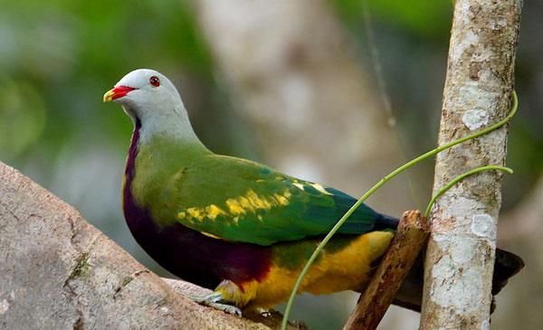 帕勞國鳥,羽毛顏色非常豐富,灰綠色的身體,綠色的翅膀,頭冠呈鮮紫色。羽毛的顏色和它們棲息的林地樹葉的顏色十分相似。主要在樹頂覓食,偶爾也到地面上捕食。