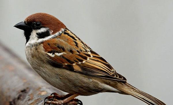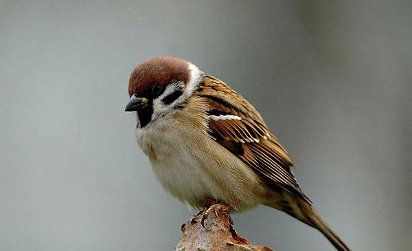 頭體長12-15cm,重14-24g。額、頭頂至后頸栗褐色,頭側(cè)白色,耳部有一黑斑,在白色的頭側(cè)極為醒目。背沙褐或棕褐色具黑色縱紋。頦、喉黑色,其余下體污灰白色微沾褐色。翅上有兩道顯著的近白色橫斑紋。虹膜暗紅褐色,嘴一般為黑色,但冬季有的呈角褐。腳和趾等均污黃褐色。鳴聲極噪雜,略似zek-zek-chi。平時總是三五只或更多的群集,嘰嘰喳喳叫得不休,特別是集大群時,百米以內(nèi)均可聽到。