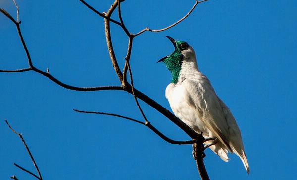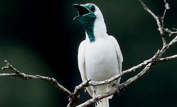 巴拉圭國鳥,雄鳥的羽毛呈雪白色,有光澤。裸眼,喉嚨和下頸部沒有羽毛,呈亮藍色。鳥喙適中而偏垂,先端具鉤。腿較短,尾中等,方形。雄鳥為了吸引雌鳥交配,會發(fā)出像錘子敲鐘的聲音,因此得名。