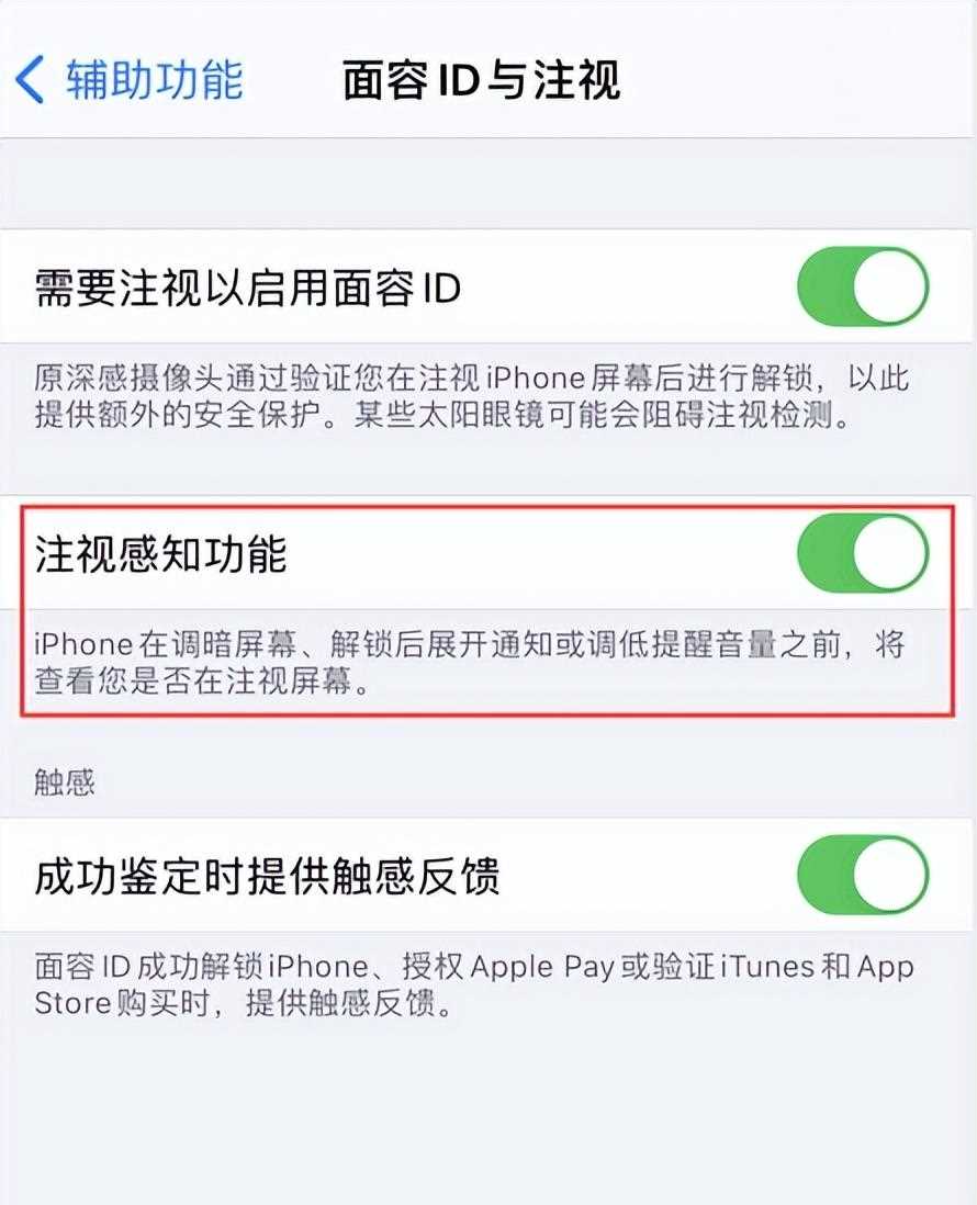 如果你不太習(xí)慣這個(gè)功能,可以進(jìn)入設(shè)置 - 輔助功能 - 面容ID與注視,將注視感知功能關(guān)閉。