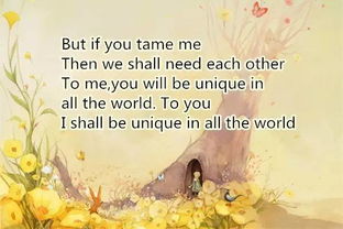 但是,如果你馴服了我,我們就互相不可缺少了。對我來說,你就是世界上唯一的了;我對你來說,也是世界上唯一的了。