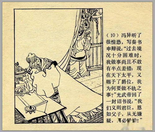 馮異聽了很惶恐,寫奏書申辯說:“過去境況十分困難時,我做事尚且不敢有半點差錯;現(xiàn)在天下太平,又賜予了爵位,我為何要做不軌之事?”光武帝回了一封詔書說:“我們義則君臣,恩如父子,從無嫌疑,何必懼怕!”