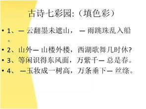 (二)古詩七彩園:(填色彩) 1?春色滿園關不住,一枝 杏出墻來。 2?山外 山樓外樓,西湖歌舞幾時休? 3?等閑識得東風面,萬 千 總是春。