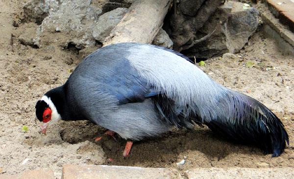 體長84-100cm,重1.8-3kg。雄鳥頭頂被以黑色的軟而卷曲的短羽如絨,頭側(cè)裸出,滿布緋紅色疣狀突,格外醒目。體羽形長,呈毛發(fā)狀。兩翅稍圓。體羽主要為藍(lán)灰色。尾藍(lán)黑色,具綠藍(lán)色金屬光澤。尾略側(cè)扁或平扁,有22枚尾羽,中央尾羽比較平扁,其羽支短,也不披散,整個(gè)尾部是向下拖垂的。羽色介于白馬雞和藍(lán)馬雞之間,近灰色馬雞。喉,耳羽簇及枕部白色,與黑色頭蓋及灰色體羽成對比。虹膜橙黃色,嘴角質(zhì)色,腿、腳紅色。