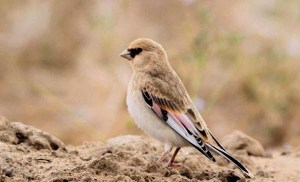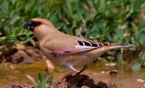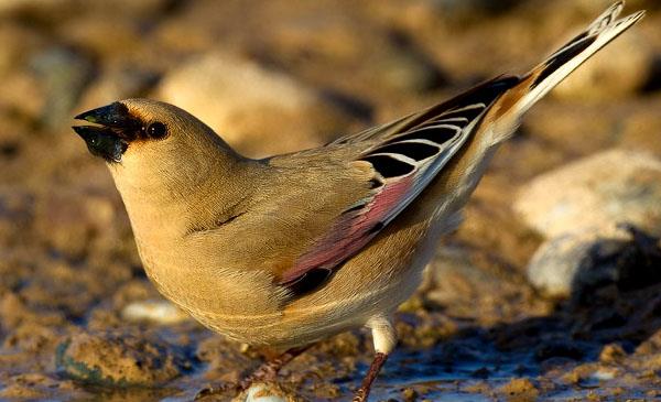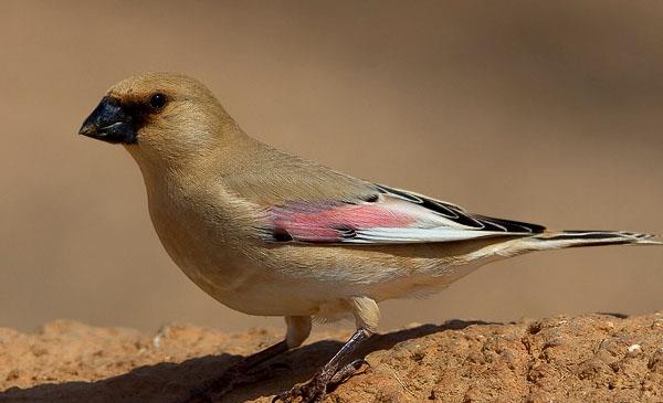 體長約15cm。兩翼粉紅,嘴亮黑,具厚大的黃嘴,翼及尾羽黑而帶白色及粉紅色羽緣。雄鳥頭頂黑褐,背褐有黑色縱紋,腰褐而沾粉紅。眼周緋紅,頰褐,眉紋。虹膜深褐,嘴黑色,腳深褐。與其他沙雀的區(qū)別在色較深,體羽多雜斑,頂冠色深且嘴較厚。