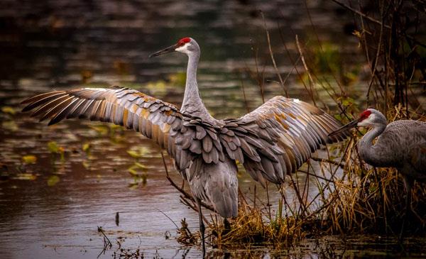 沙丘鶴:別名棕鶴_大沙丘鶴_古巴沙丘鶴_加拿大沙丘鶴,為鶴形目、鶴科、鶴屬鳥類,原產(chǎn)于北美洲及西伯利亞東北部,包括中國、加拿大、美國、古巴、日本、韓國、墨西哥、俄羅斯等地。模式產(chǎn)地在加拿大哈得遜灣。野生于富有灌叢和水草的平原沼澤、湖邊草地、水塘及河岸沼澤地帶,有時也出現(xiàn)在有樹木和草本植物的高原地帶。1758年命名,共6個亞種。因工業(yè)、水利、捕魚、放牧、開荒、放水養(yǎng)葦與割葦?shù)?,造成棲息地的破壞,造成?shù)量下降。1989年被列為我國2級重點保護(hù)野生動物。
