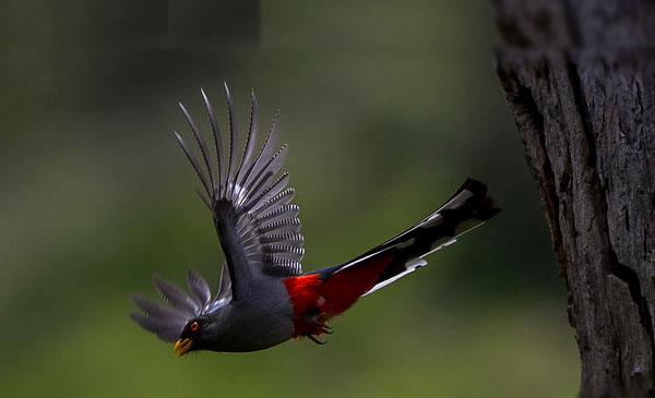 海地國(guó)鳥,小型攀禽。羽色艷麗,頭部黑色,深灰色脖頸,上體具是具金屬光澤的輝綠色,胸部灰色,腹部鮮紅色。雖飛行速度快,但生性懶惰,通常棲止在灌木叢中或高枝上啁哳鳴囀。