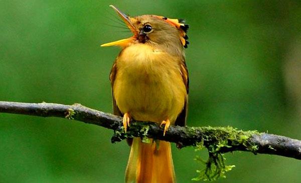 這種雀鳥營巢而居,筑的巢很精巧,通常懸掛于樹枝和藤蔓上。在求偶時,皇霸鹟會立馬放下架子,開始賣萌,它不僅會撐開頭上的“冠冕”,還會有節(jié)奏地左右擺動起小小腦袋,生怕別人看不到它美美的皇冠。