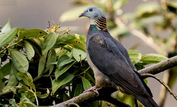 頭體長35-40cm,重約310g。頭頂至枕鴿灰色,頭側(cè)稍淡,后頸下部有一顯著的皮黃色半領(lǐng)圈,羽基具黑色斑點。尾上覆羽石板灰色,較長的尾上覆羽和尾羽黑褐色,翅上覆羽鉛灰褐色,內(nèi)側(cè)較暗。頦、喉白色,胸灰褐色,腹暗黃色,兩脅略帶紫灰色。虹膜淡黃色,嘴黃色,蠟?zāi)さG色。腳和趾深紅色或紫紅色,爪角黃色。叫聲為低沉而連續(xù)的“嗚、嗚”聲。