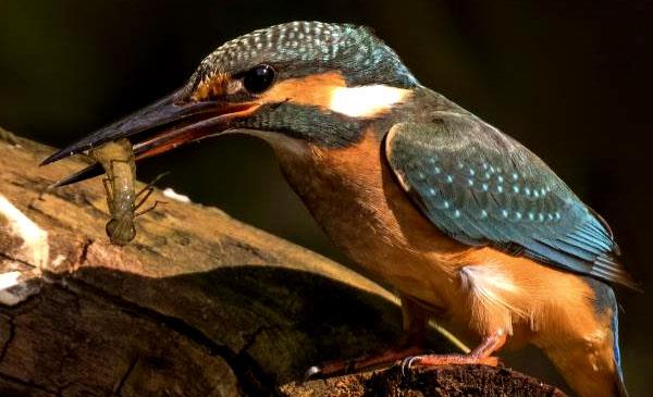 上體黑褐色,背部中央具一亮綠色縱線,耳羽藍(lán)色,下體栗色,外形似普通翠鳥,但體型更大,無(wú)普通翠鳥的橘黃色過(guò)眼紋。捕魚本領(lǐng)很強(qiáng),扎入水中后,眼睛能迅速調(diào)整光線造成的視角反差,也能保持極佳的視力。